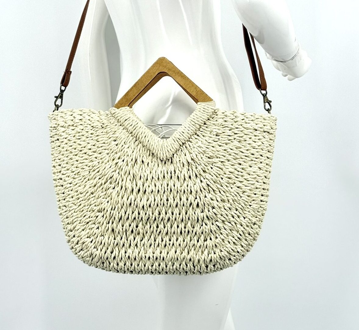 Táto štýlová kabelka v boho štýle je doplnená o zaujímavú drevenú rúčku, ktoré jej dodávajú jedinečný a prírodný vzhľad. Má praktické zipsové zapínanie, jedno vnútorné bočné vrecko a dlhý popruh na pohodlné nosenie cez rameno. Ideálna na letné prechádzky, festivaly alebo ako originálny doplnok ku každodennému outfitu.